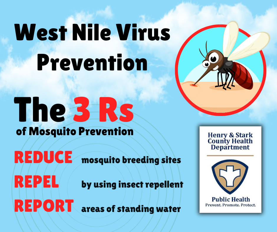Wet warm summer means mosquito season is still underway in Illinois. With this comes the risk of West Nile virus – WNV, which has been confirmed from environmental samples in both Henry and Stark County. The Henry & Stark County Health Departments is reminding everyone of the importance of taking action to “Fight the Bite.” by practicing the three “R’s” – reduce, repel and report.