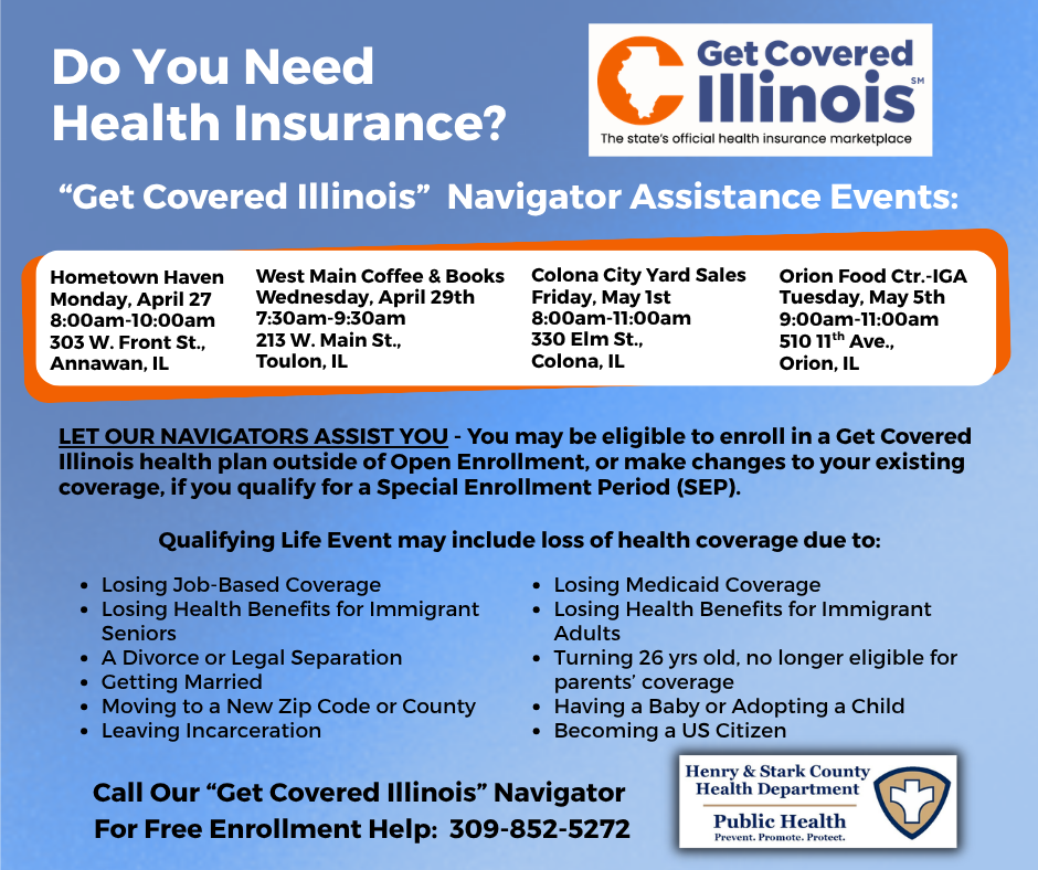 The Henry and Stark County Health Departments and the Get Covered Illinois Navigator Program asks, “Do You Need Health Insurance?” Our Health Insurance Navigators will be present at the upcoming local events to assist anyone looking to set up health insurance coverage: