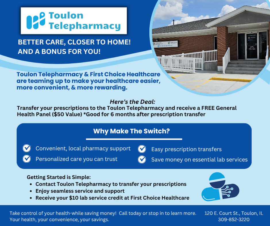 Anyone interested in these healthcare incentives can simply contact the Toulon Telepharmacy to transfer their prescriptions by calling 309-852-3220. And then enjoy seamless service and support. In addition, participants will receive an additional $10 lab service credit at First Choice Healthcare.