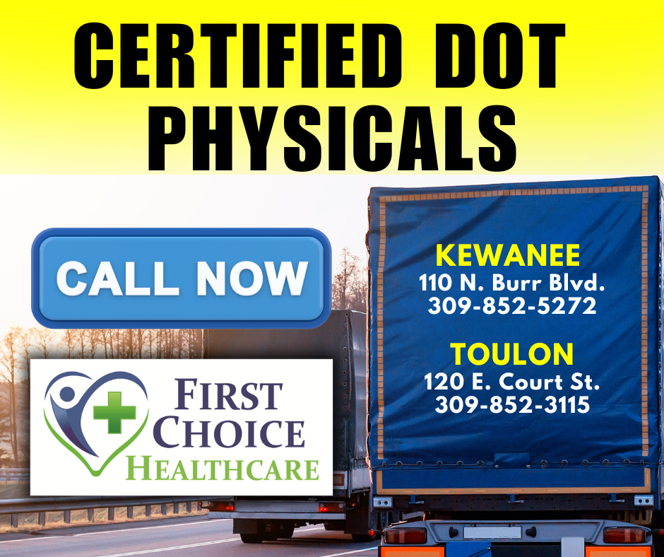 Please note appointments for DOT Physicals, which are necessary, may be made by contacting the First Choice Healthcare Clinic nearest you Kewanee 309-852-5272; and Toulon 309-852-3115. For more information visit their website at www.henrystarkhealth.com or find them on Facebook at Henry and Stark County Health Departments