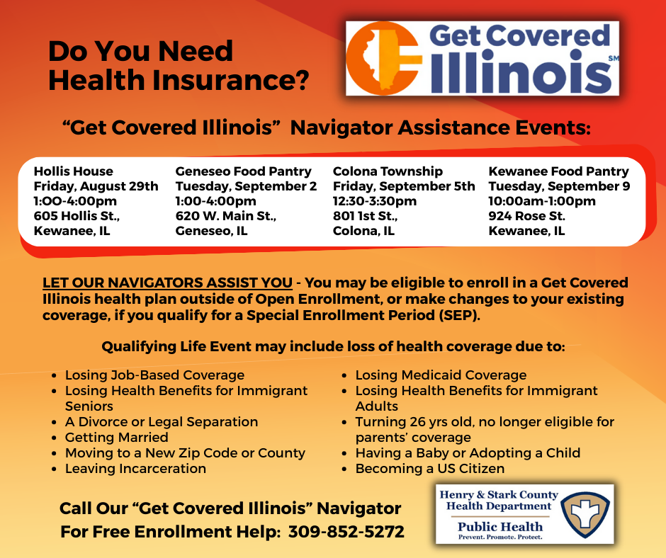 The Henry and Stark County Health Departments and the Get Covered Illinois Navigator Program asks, “Do You Need Health Insurance?” Their health insurance navigators will be present at some upcoming local events to assist anyone looking to set up health insurance coverage: