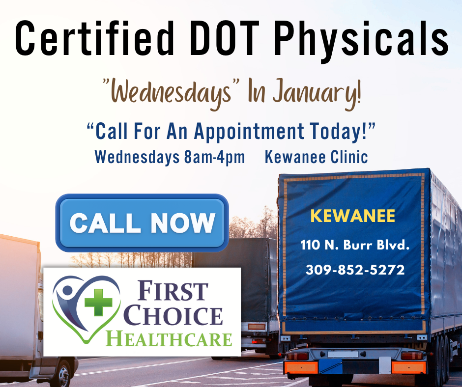 The Henry and Stark County Health Department and their First Choice Healthcare Clinic in Kewanee (110 N. Burr Blvd) announce they will be conducting certified DOT physical clinics every Wednesday in January. Please note appointments, which are necessary, can be made by calling the clinic at 309-852-5272 Kewanee. Appointments will be offered every Wednesday in January from 8 a.m. – 4 p.m. at each location.