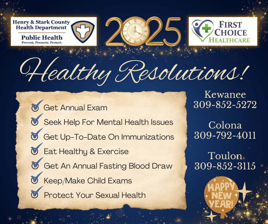 Planning your New Year’s resolutions for 2025? The Henry and Stark County Health Department and their First Choice Healthcare Clinics offer the following Healthy Resolutions Checklist to consider: