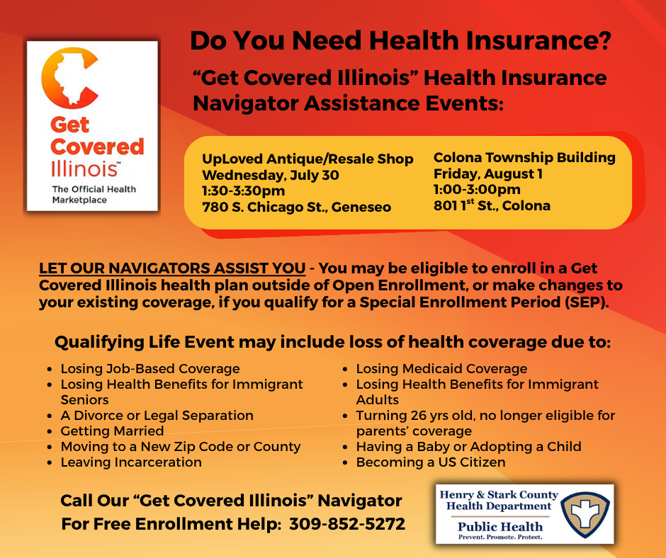 The Henry and Stark County Health Departments and the Get Covered Illinois Navigator Program asks, “Do You Need Health Insurance?” Their Health Insurance Navigators will be present at some upcoming local event to assist anyone looking to set up health insurance coverage: