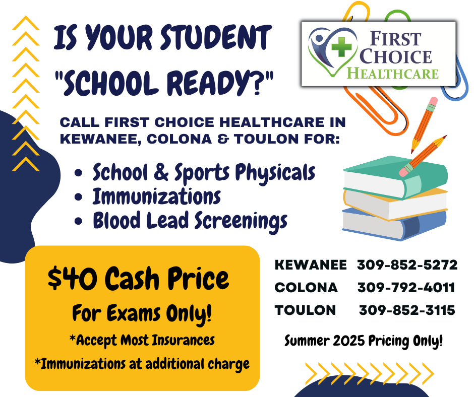 First Choice Healthcare will offer school and sports physicals at all their locations at a cash price of only $40. Those with insurance coverage, please bring insurance information if billing to insurance. Appointments are available at their clinics in Kewanee, 110 N. Burr Blvd. 309-852-5272; Colona, 103 First St. 309-792-4011; and Toulon, 120 E. Court St. 309-852-3115.