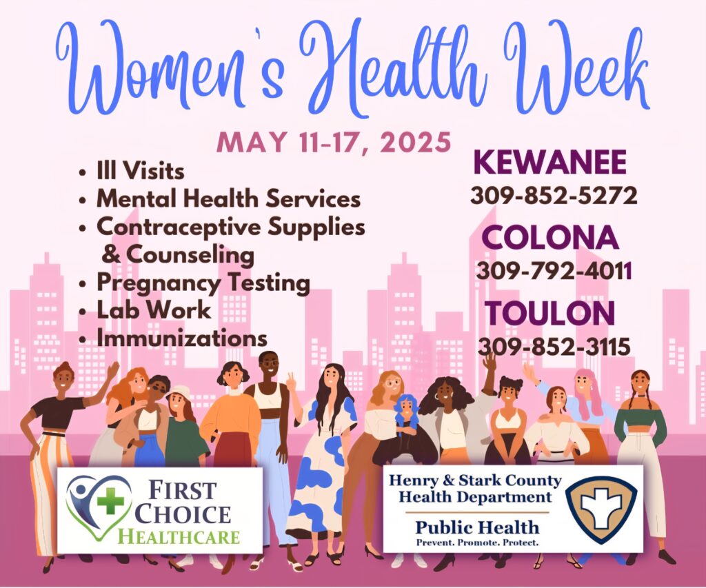 During Women’s Health Week, the health department hopes to raise awareness of the women’s health services available at their First Choice Healthcare locations. The First Choice Healthcare Clinics in Kewanee, Colona and Toulon offer area women such services as annual exams, pap smears, pregnancy testing, contraceptive counseling and supplies, clinical breast exams, fasting blood profiles and lab services, immunizations, and our mental health services. Payment for Department services include private pay, medicaid, and most insurances.