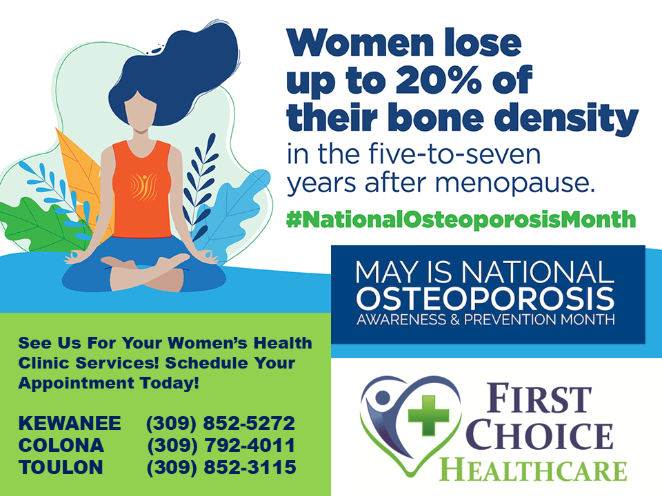 The Henry and Stark County Health Departments ask, “Did you know that two million broken bones occur every year in the U.S. due to osteoporosis?” It’s true, but most people get their fracture fixed without ever realizing they have osteoporosis or low bone mass. Join their First Choice Healthcare Clinics and the National Osteoporosis Foundation, in celebrating National Osteoporosis Month this May by taking action to Break Free from Osteoporosis. Break Free from Osteoporosis is a campaign that encourages everyone to get to know their risk factors for osteoporosis and make the lifestyle changes needed to build strong bones for life.