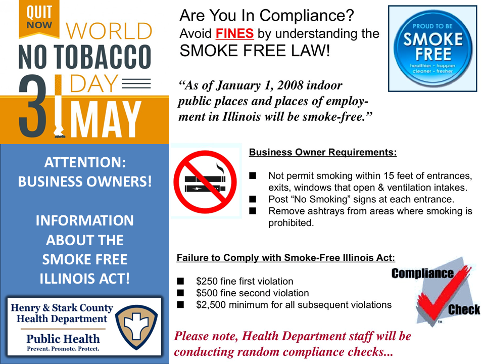 For more information about the Health Department’s Illinois Tobacco-Free activities, or for “No Smoking” signs or window clings for your business; call 309-852-0197 Extension 249 or download a sign by visiting their website at www.henrystarkhealth.com.