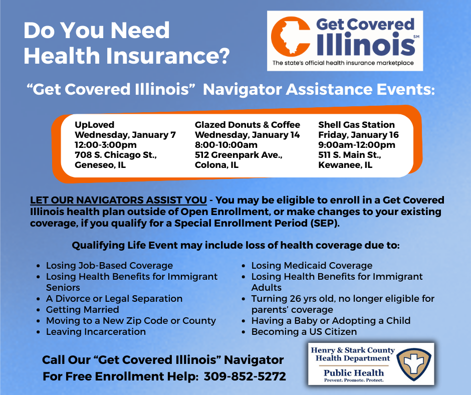 The Henry and Stark County Health Departments and the Get Covered Illinois Navigator Program asks, “Do You Need Health Insurance?” Their Health Insurance navigators will be present at the upcoming local events to assist anyone looking to set up health insurance coverage: