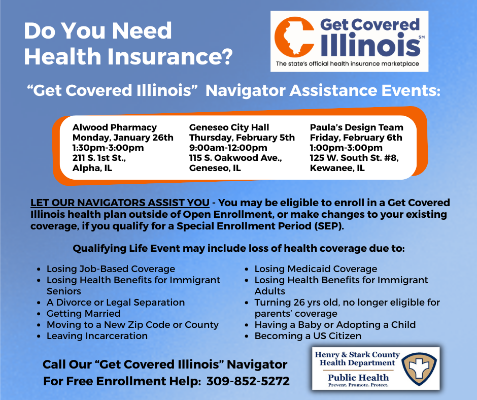 The Henry and Stark County Health Departments and the Get Covered Illinois Navigator Program asks, “Do You Need Health Insurance?” Their Health Insurance Navigators will be present at the upcoming local events to assist anyone looking to set up health insurance coverage: