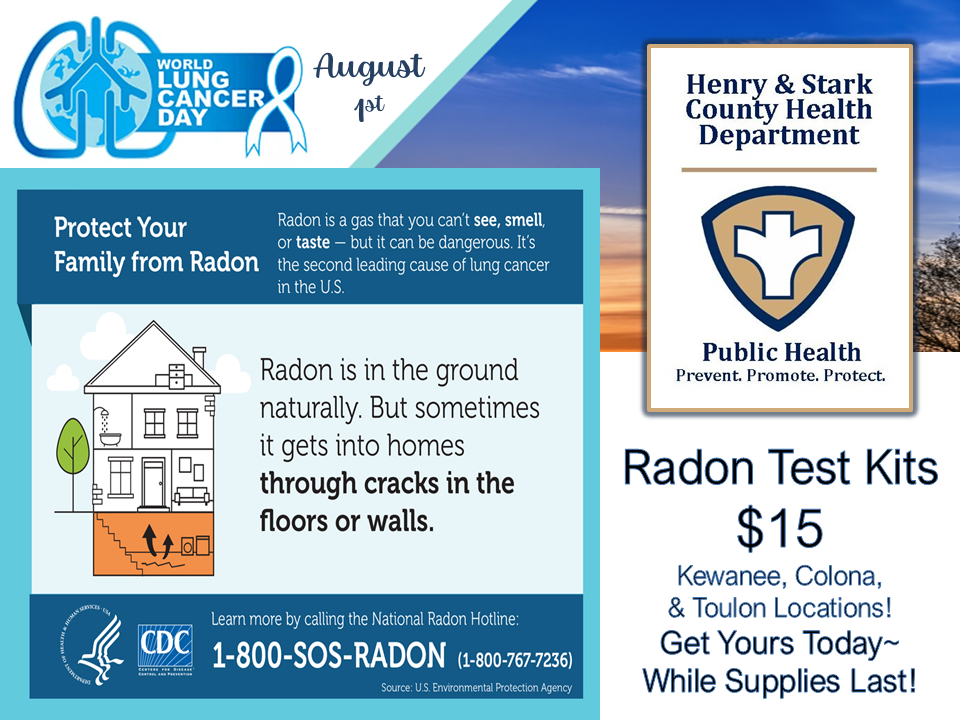 The Henry and Stark County Health Departments note that Aug. 1 has been proclaimed World Lung Cancer Day. The Health Department believes this important health observance is a good time to remind local residents that radon is the second-leading cause of lung cancer overall and the leading cause of lung cancer for non-smokers.