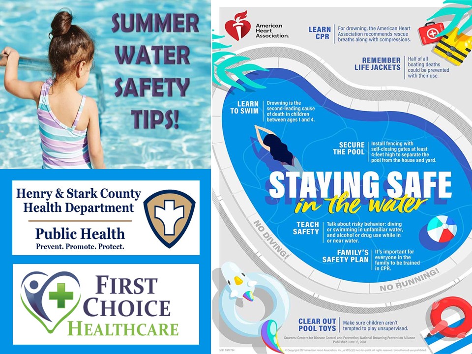 The Health Department and First Choice Healthcare Clinics in Kewanee and Colona encourage everyone to follow these important water safety guidelines to ensure that everyone has a fun and safe summer swimming season. Find them on Facebook at Henry and Stark County Health Departments or follow them on Twitter and Instagram.