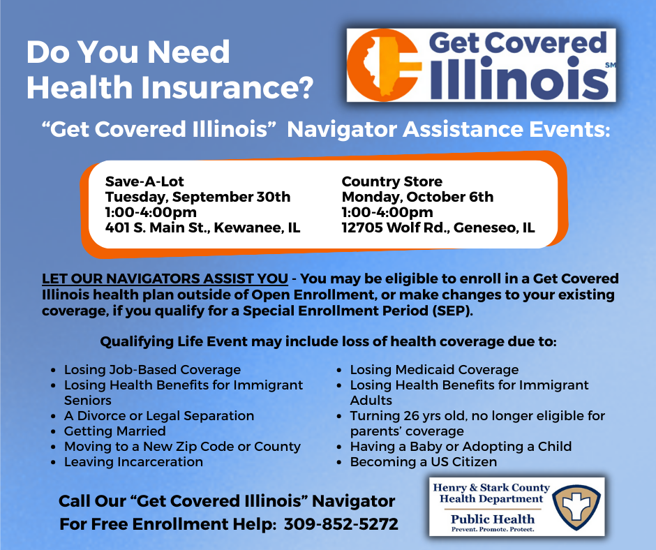The Henry and Stark County Health Departments and the Get Covered Illinois Navigator Program asks, “Do You Need Health Insurance?” Their Health Insurance Navigators will be present at an upcoming local event to assist anyone looking to set up health insurance coverage: