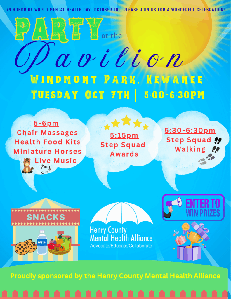 The Henry County Mental Health Alliance is inviting the public to their Party at the Pavilion, in observance of the upcoming World Mental Health Day on Tuesday, Oct. 7 from 5-6:30 p.m. at Windmont Park in Kewanee.
