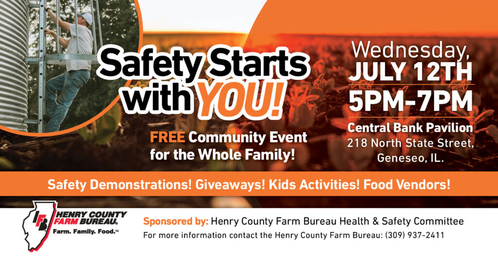 The Henry County Farm Bureau Health and Safety Committee will hold a free community event focused on areas of safety, health, and wellness on Wednesday, July 12, 5 -7 pm. The event will be located at the Central Bank Pavilion, 218 North State Street in Geneseo. Following the event will be the Central Bank Concert featuring Angela Meyer, from 7-9 pm.