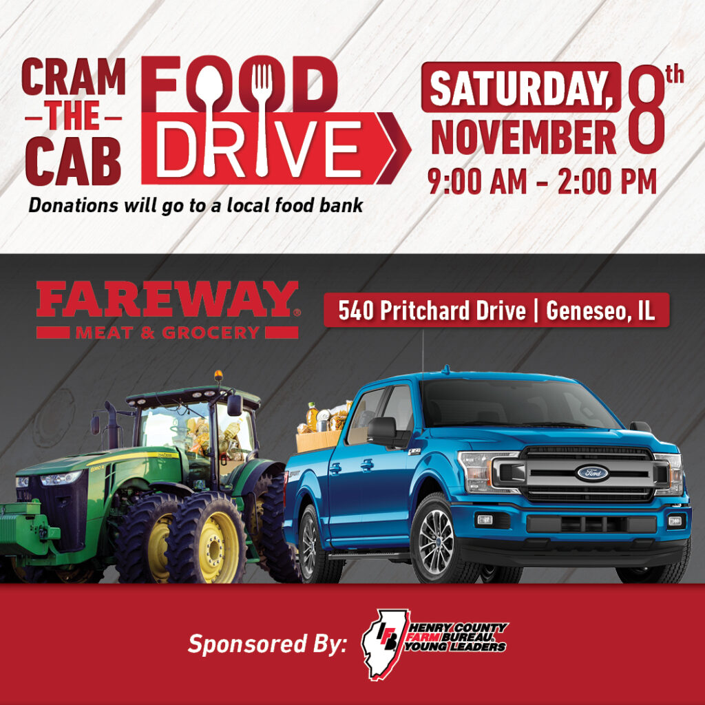 The Henry County Farm Bureau Young Leaders are inviting the public to participate in their annual “Cram the Cab” food drive on Saturday, Nov. 8, from 9 a.m. to 2 p.m. at Fareway Meat & Grocery, located at 540 Pritchard Drive in Geneseo.