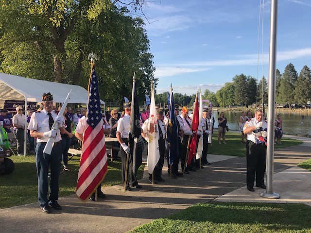 Above, Relay for Life participants line the bridge at Windmont. Below, the Kewanee Veterans Council Color Guard opens the ceremony. [Submitted photos]