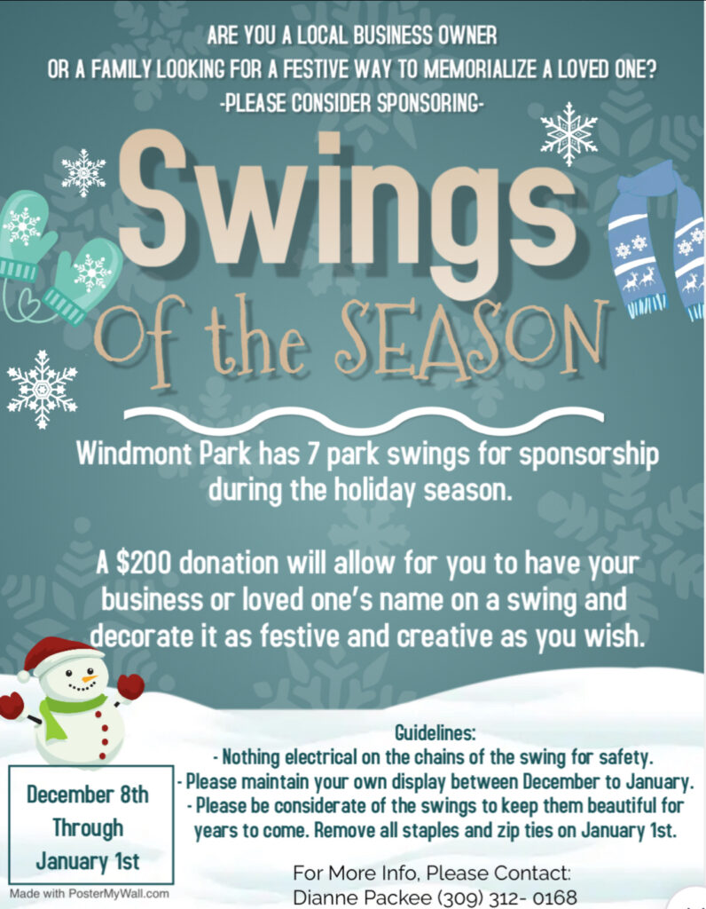 Let’s keep the memories going at Windmont Park this December. Please register for your swing on a first-come, first-serve basis by contacting Dianne Packee at 309-312-0168.