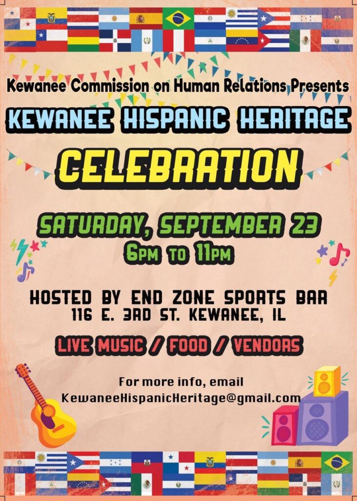 The Kewanee Commission on Human Relations, along with End Zone Sports Bar, will host the first Kewanee Hispanic Heritage Celebration on Saturday, Sept. 23, from 6 to 11 pm. The event will be held at End Zone, located at 116 E. Third St., and feature music, food and vendors.