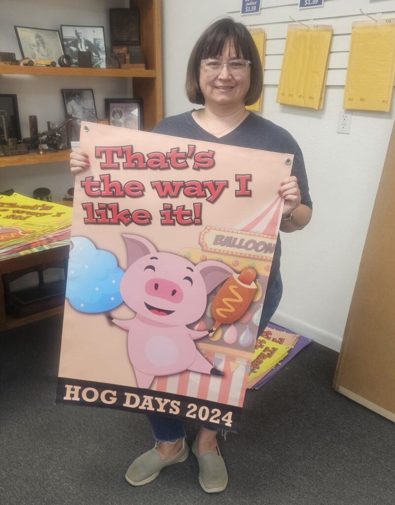Lee Bailleu, owner of B&B Printing, holds up the 2024 Hog Days banner. The banners are available in multiple colors and are being sold at several locations. [Photo by Susan DeVilder]