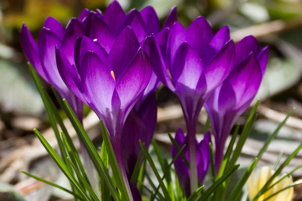 A vibrant purple crocus is among the first flowers to bloom in the author’s garden each spring. (Kewanee, Illinois, 2025). [Photo by Jill Bartelt]