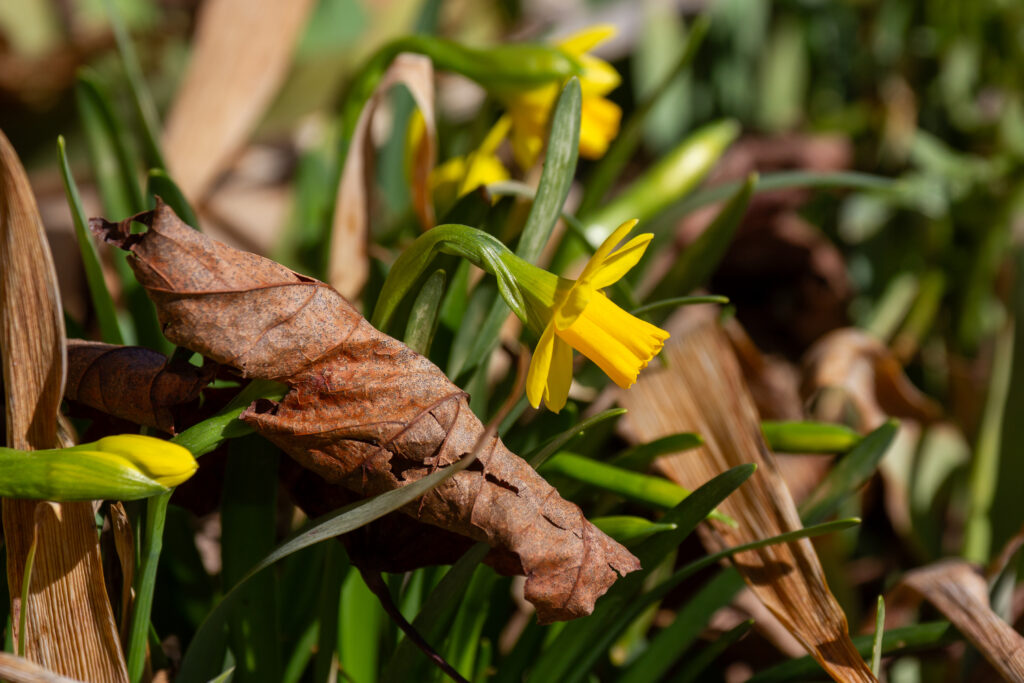 Tiny daffodils poke through fallen leaves in early spring. (Kewanee, Illinois, 2024). [Photo by Jill Bartelt]