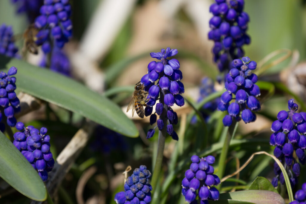 Grape hyacinth flowers reach their peak just after the daffodils. Sometimes, they attract bees. (Kewanee, Illinois, 2023). [Photo by Jill Bartelt]