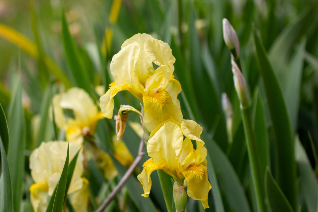 Sunshine-yellow “Nana Grace” irises (so called after the author’s grandma) often bloom once in spring and again in fall. (Kewanee, Illinois, 2025). [Photo by Jill Bartelt]