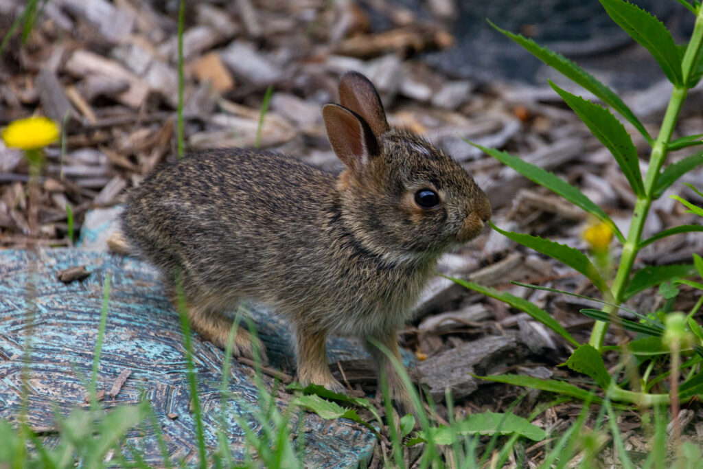 A tiny baby bunny investigates the author’s front garden. (Kewanee, Illinois, 2025). [Photo by Jill Bartelt]