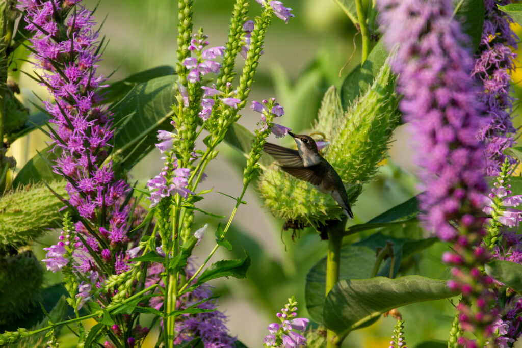 In summer, wildflowers draw hummingbirds and other pollinators into the author’s garden. (Kewanee, Illinois, 2025). [Photo by Jill Bartelt]