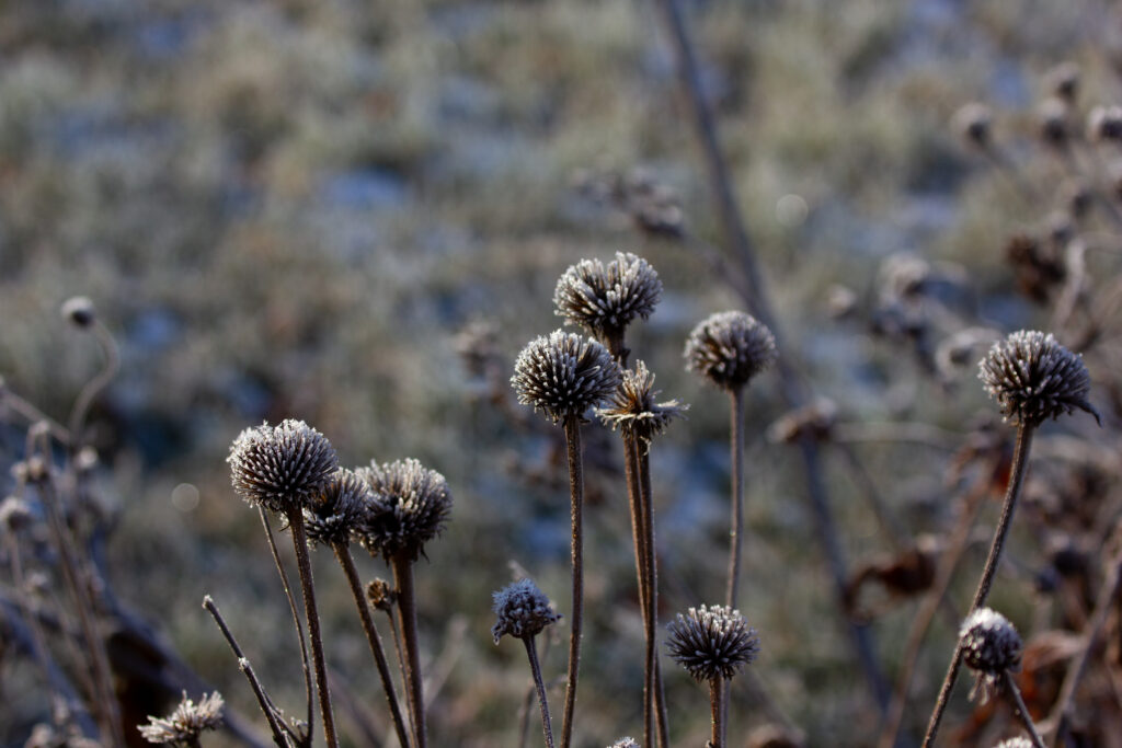 Frost glistens on the heads of coneflowers. Even in winter, the garden holds life, as birds feast on coneflower seeds and bees hibernate in flower stems. (Kewanee, Illinois, 2023). [Photo by Jill Bartelt]