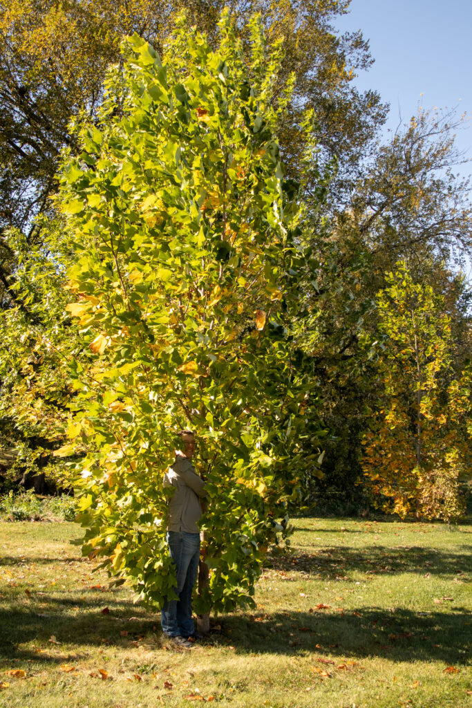 This tulip tree was a six-inch sprig in 2020, when the author transplanted it from her family home near Washington, Illinois, to her house in Kewanee. It now towers over her husband, Marc (who, for reference, is 6’2″). (Kewanee, 2025) [Photo by Jill Bartelt]
