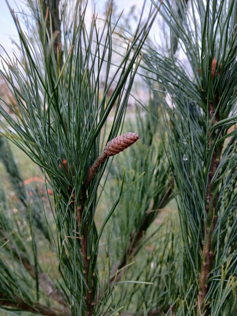 Last fall (2024), the author found the first tiny pinecone growing on one of the white pines transplanted from her family home in 2020. (Kewanee, 2024). [Photo by Jill Bartelt]