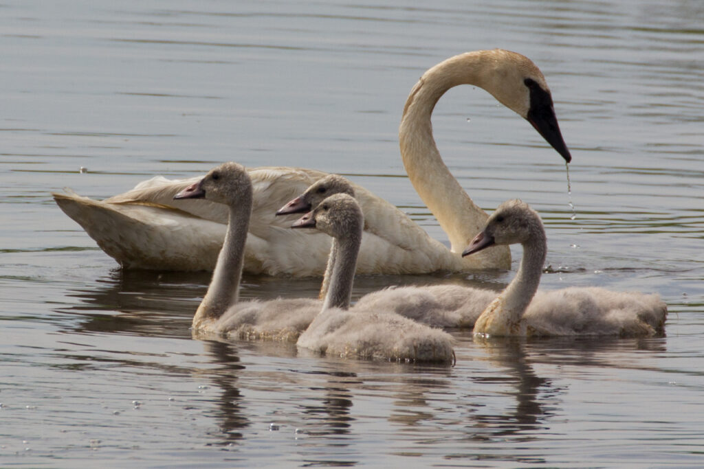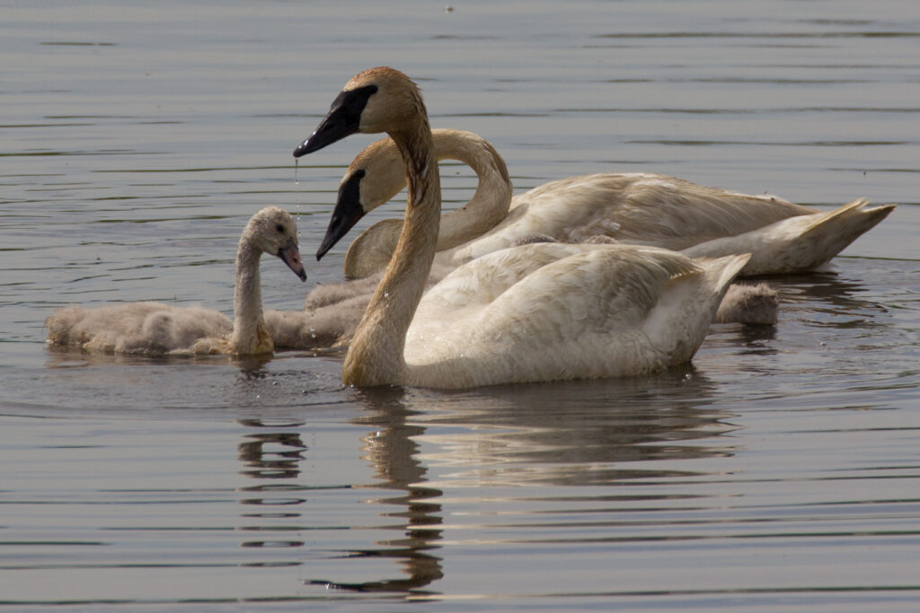 Even by the high standards of Dixon, though, one bird that I saw that day in 2022 was unusual. I was looking through the long lens of my camera when I noticed a swan with distinctive traits. The black bill meant that it was a trumpeter swan, the largest waterfowl native to North America (mute swans, which are slightly smaller and have orange bills, are native to Eurasia). This sighting was a thrill for me, because I had fallen in love with trumpeter swans years earlier. In flight, they are ethereal, their outstretched ivory wings gleaming with hints of gold and violet in the sun. On the water, they glide with perfect grace and elegance. They are devoted mates and tender parents, guiding and protecting their fluffy gray cygnets through the perils of life as a young, wild swan.