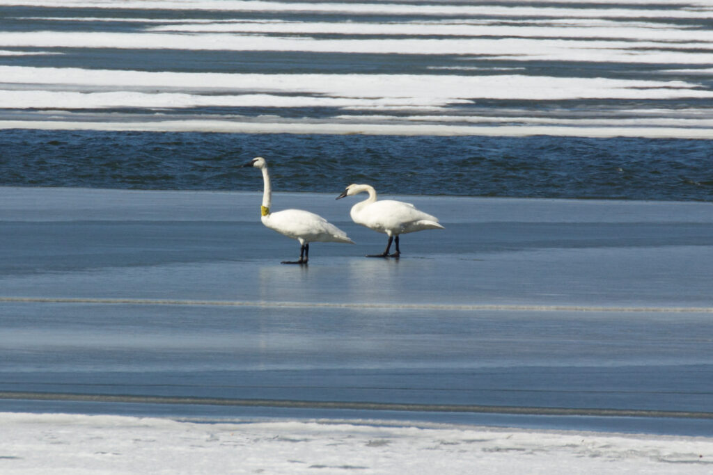 One part of the answer comes from something strange I noticed about “my” swan that February day—it wore a broad, yellow collar around the neck. Someone, somewhere had banded this swan! In the United States, bird banding is administered by the Bird Banding Laboratory, under the US Geological Survey. People who see banded birds in the wild are encouraged to report these sightings to the Bird Banding Laboratory, so that data can be collected on how long wild birds live, where they go, and so on. In the case of trumpeter swans, reports can also be made to The Trumpeter Swan Society, an organization dedicated to the welfare of trumpeter swans in the wild.