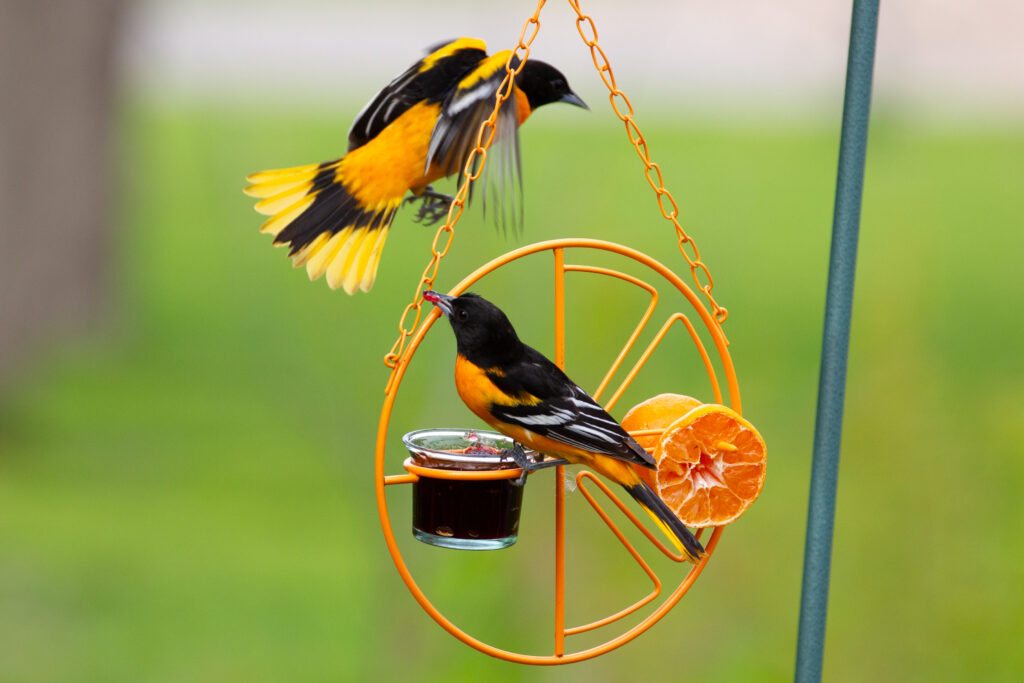 An adult male Baltimore oriole perches regally at a feeder filled with grape jelly. [Photo by Jill Bartelt]