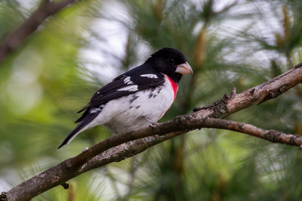 A male rose-breasted grosbeak perches in a spruce tree. Like orioles, grosbeaks are migratory and spend only a week or two in the author’s yard each spring. [Photo by Jill Bartelt]