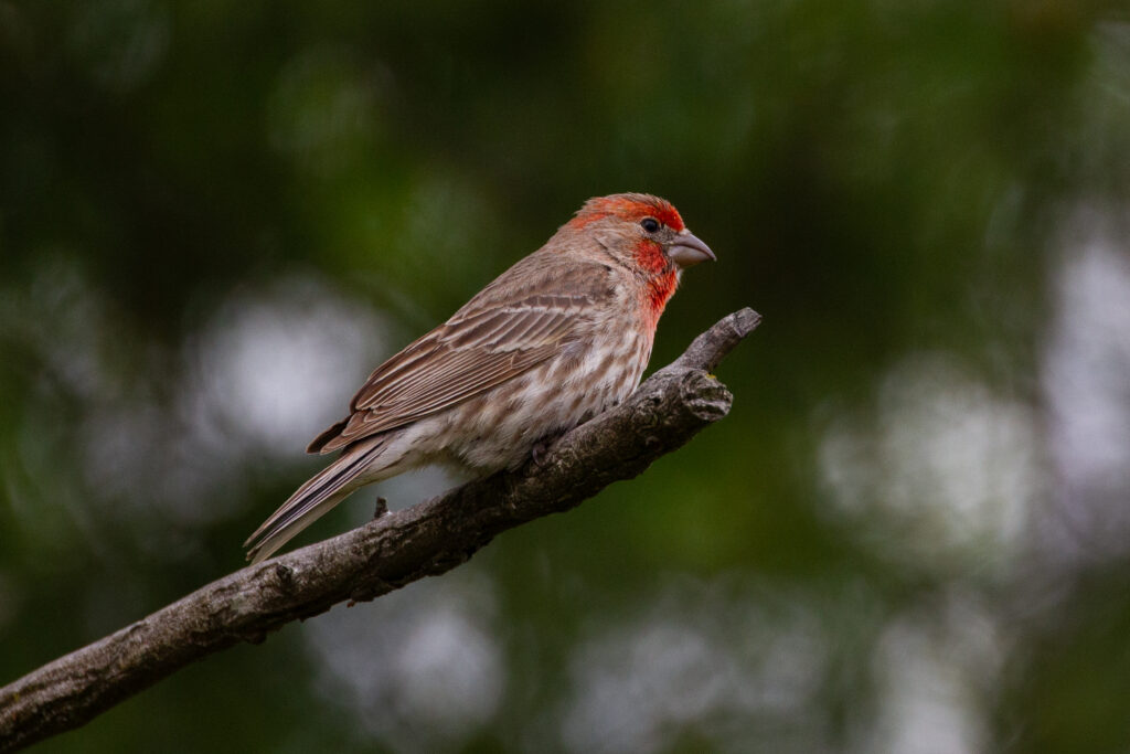 A male house finch sings a cheerful song from one of his favorite branches. [Photo by Jill Bartelt]