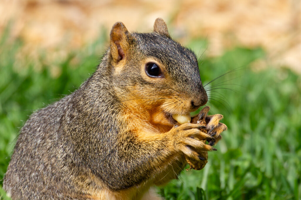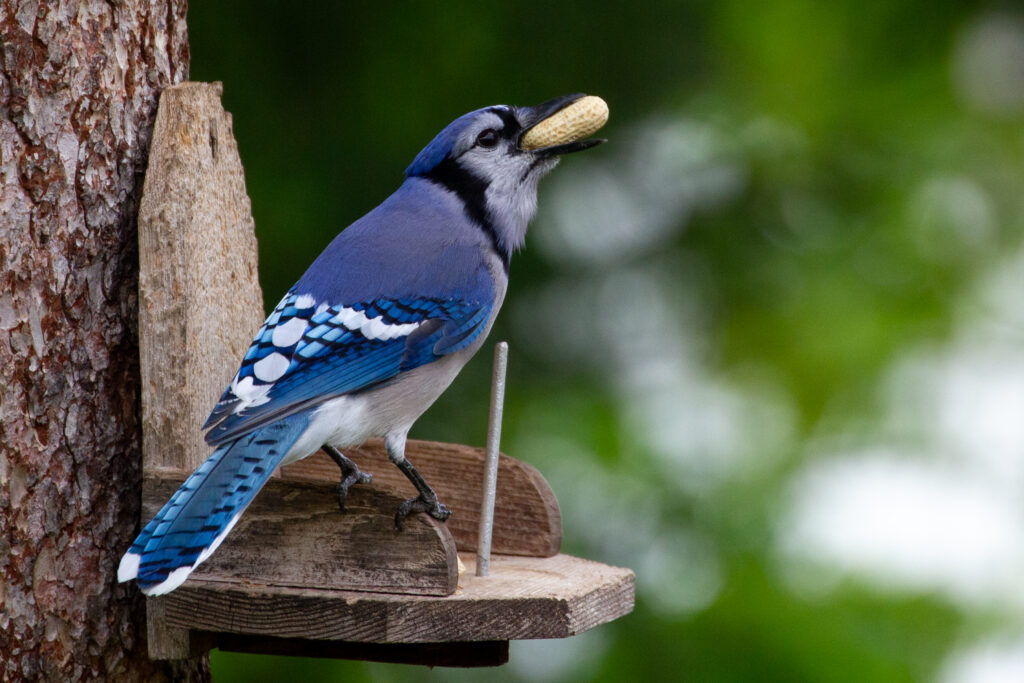 Above, a blue jay eagerly seizes a peanut and gulps it down, to eat elsewhere. Below, A fox squirrel sits at the edge of the author’s patio, nibbling a peanut that the blue jays had missed. [Photos by Jill Bartelt]