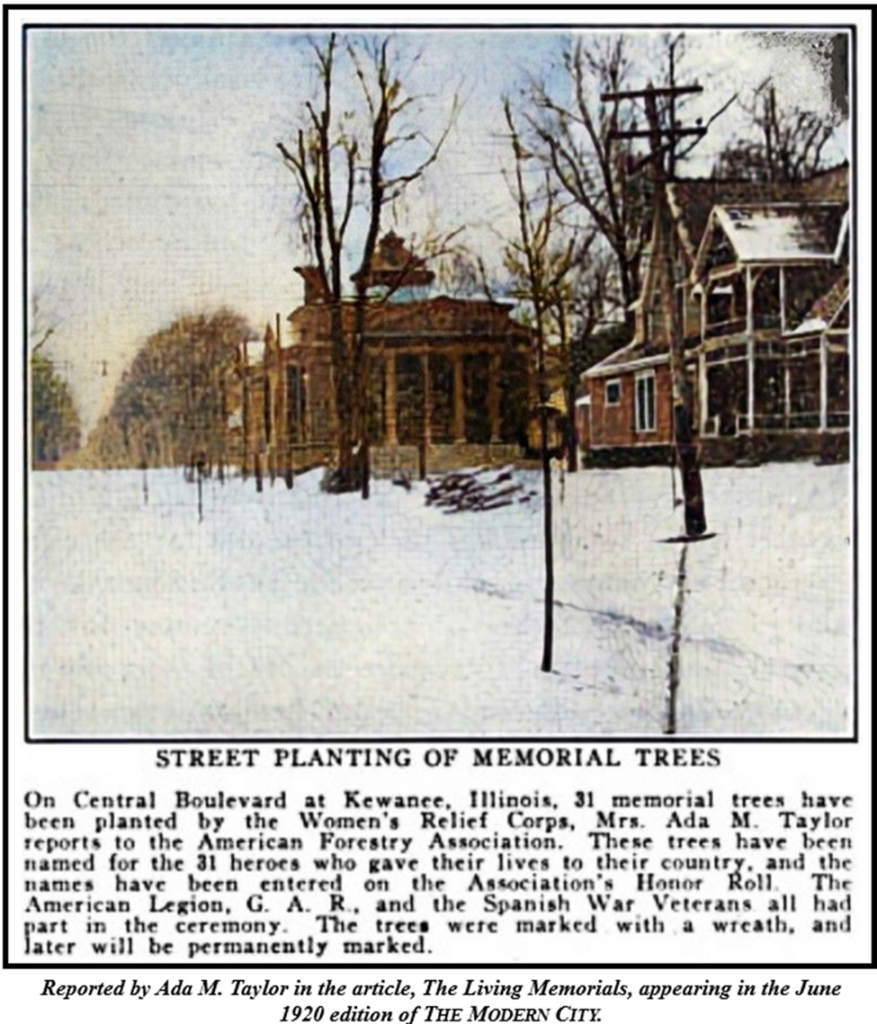 Recently I saw a 1919 photograph of Central Boulevard newly planted with 31 maple trees in memory of those from Kewanee who died in World War I.