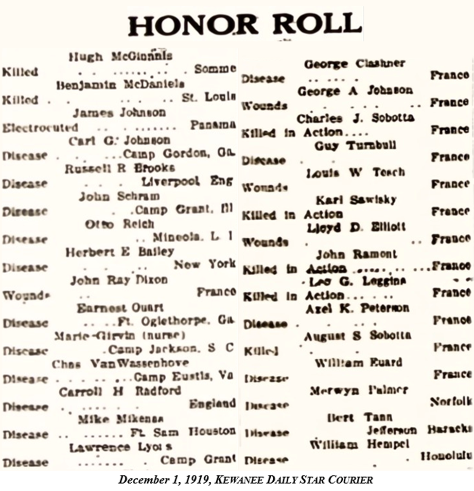 Curious, I researched the online Kewanee newspaper archives at the Kewanee Public Library and found a list of those who gave their lives in service to their country.