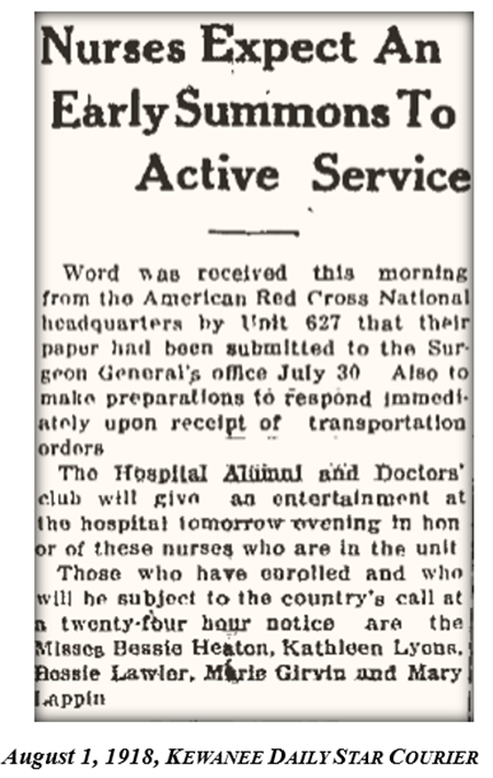 Marie continued to work at St. Francis after graduation. But as World War I progressed and United States troops prepared to embark for Europe, she and four fellow nurses, Bessie Heaton, Kathleen Lyons, Bess Lawier and Mary Lappin, joined the American Red Cross in July 1918 and prepared for immediate assignment.