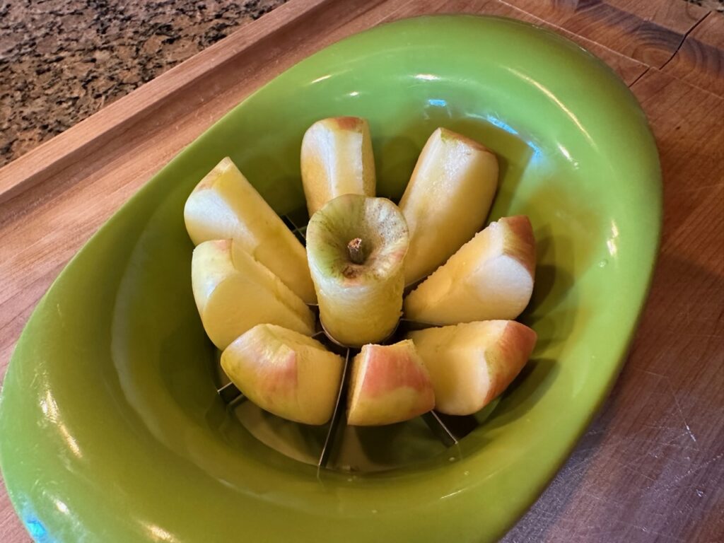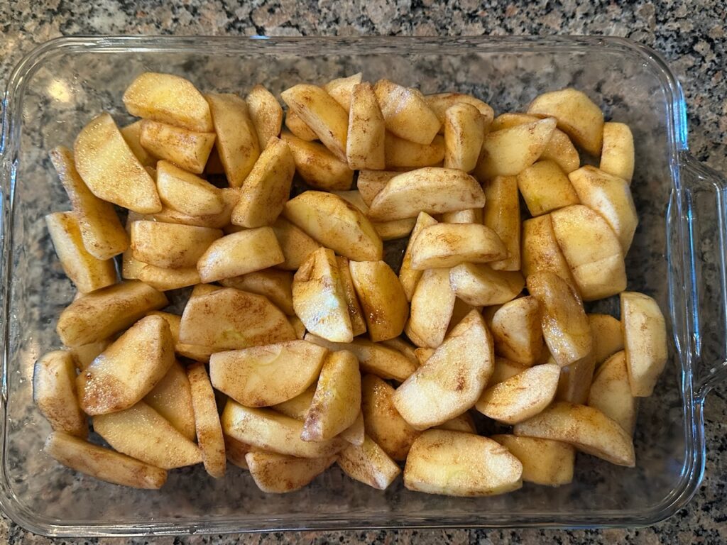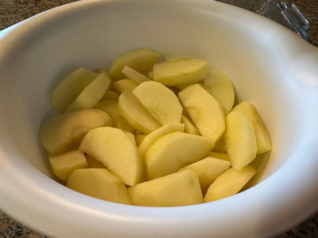 I tried a new technique for preparing the apples by using an apple slicer and then peeling the slices. I felt that it went fairly quickly and reduced some of the waste compared to my typical peeling, coring and slicing process. It also kept the apple slices very consistently sized.