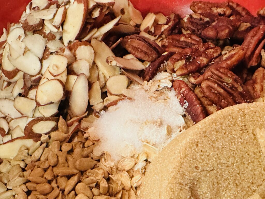 This was my first time making granola from scratch, and I was pleasantly surprised by how easy and delicious it was. The blend of old-fashioned oats, pecans, almonds, and sunflower kernels, lightly sweetened with brown sugar and honey, creates the perfect crunchy topping.