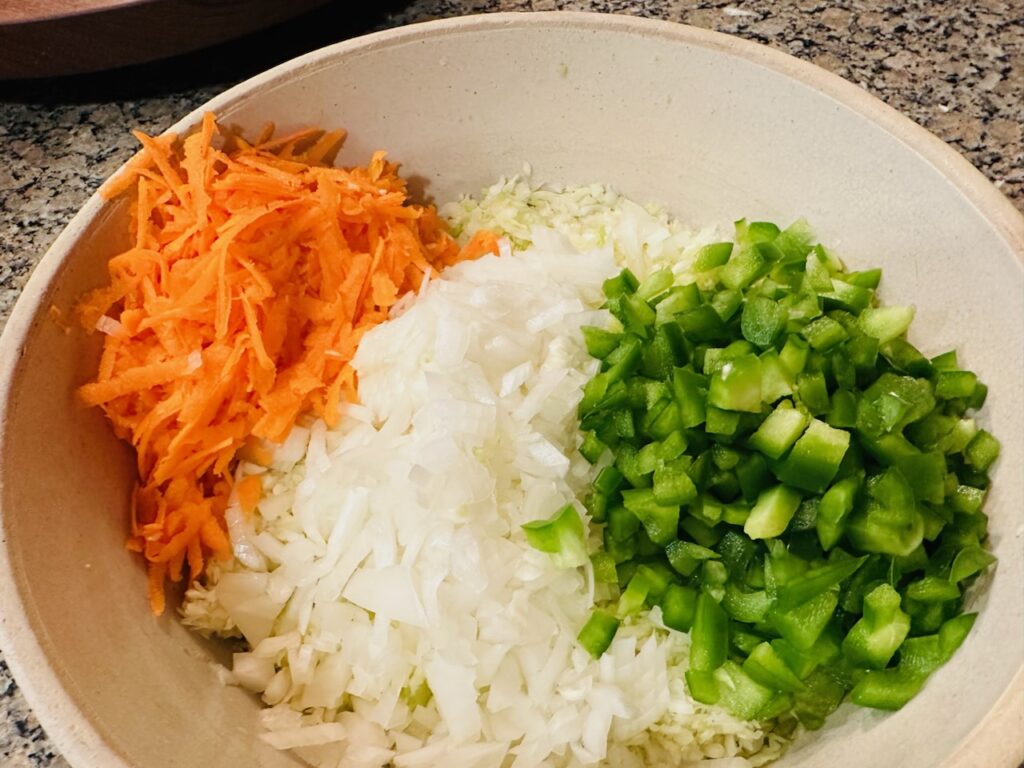 1. In a large bowl, mix together the cabbage, pepper, onion, and carrot (if using).