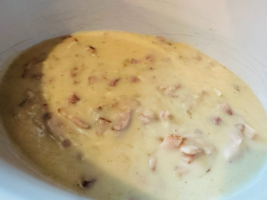 Melt butter in a skillet over medium heat. Add bacon and onion; sauté until bacon is crisp. Add flour, salt, and pepper to the skillet; mix thoroughly. Add milk; cook and stir until thickened. Transfer to a slow cooker; add remaining ingredients. Cover and cook on low setting for 2–4 hours.