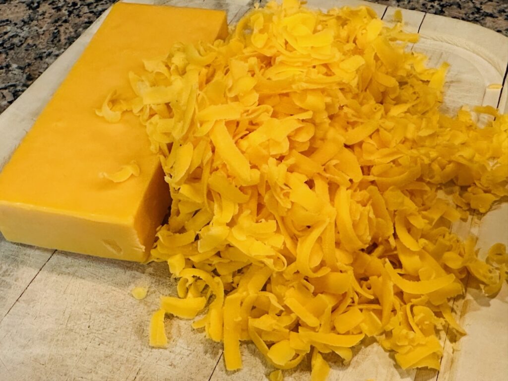 Shred sharp cheddar cheese (if not already shredded). Cube butter and Velveeta.