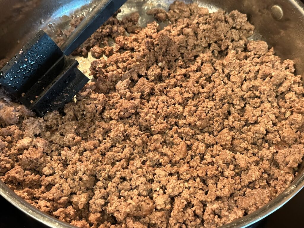 Brown beef in a skillet with one clove of the garlic and seasonings