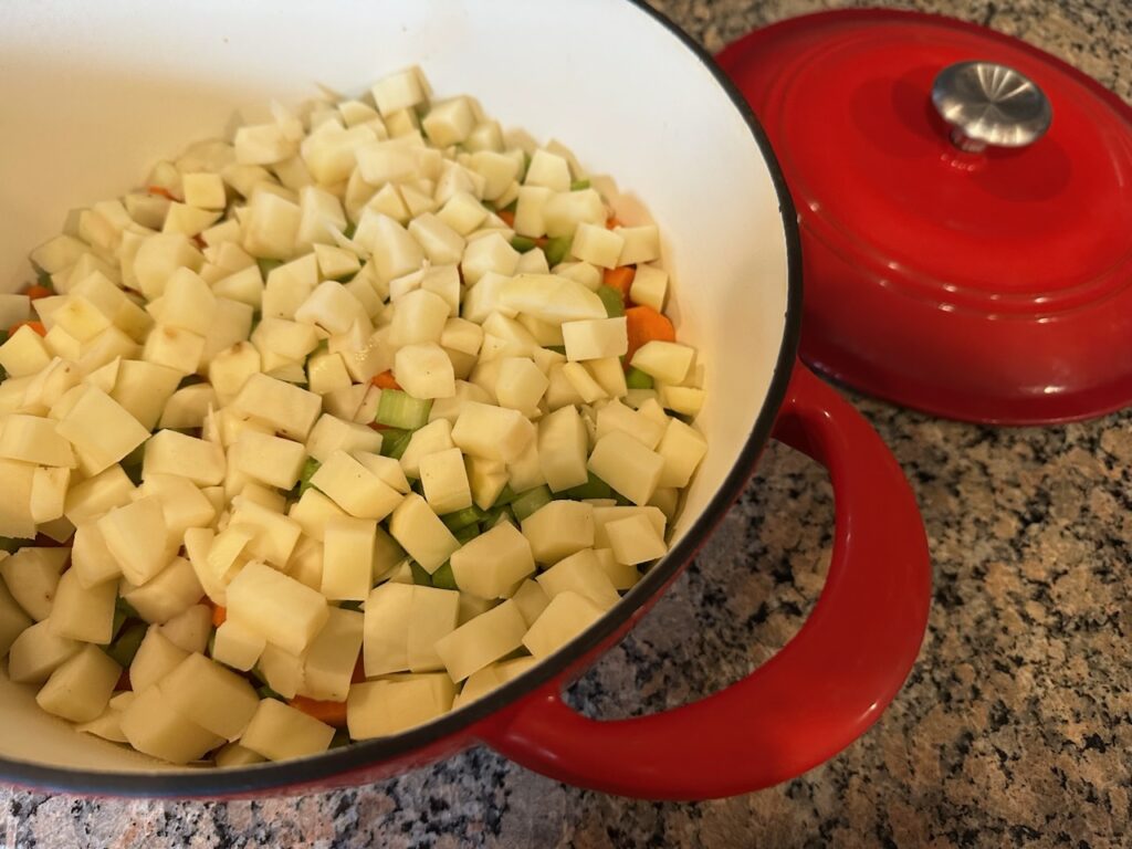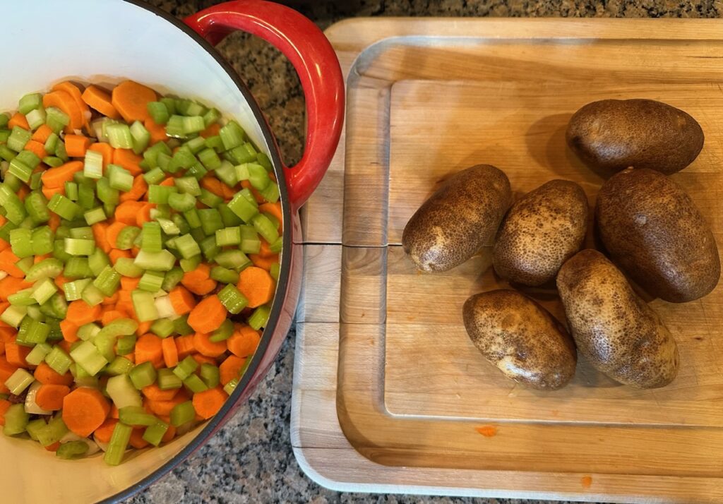 4-6 potatoes, cut into 1″ pieces, spread over celery
