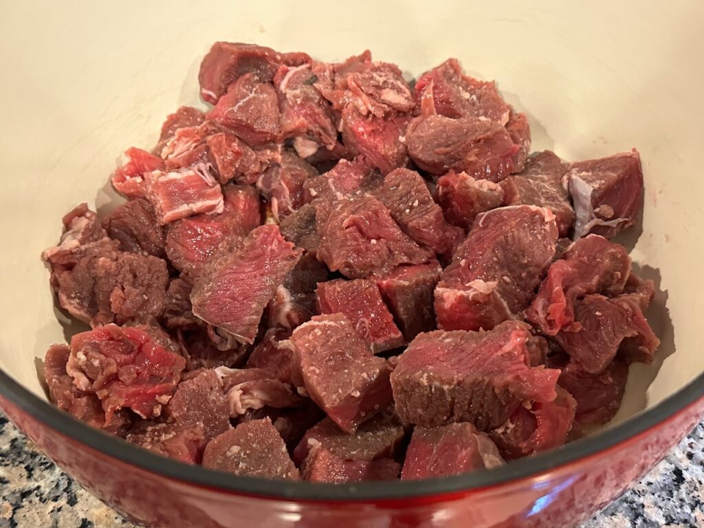 3 lbs. beef for stew in the bottom of a pan or dish